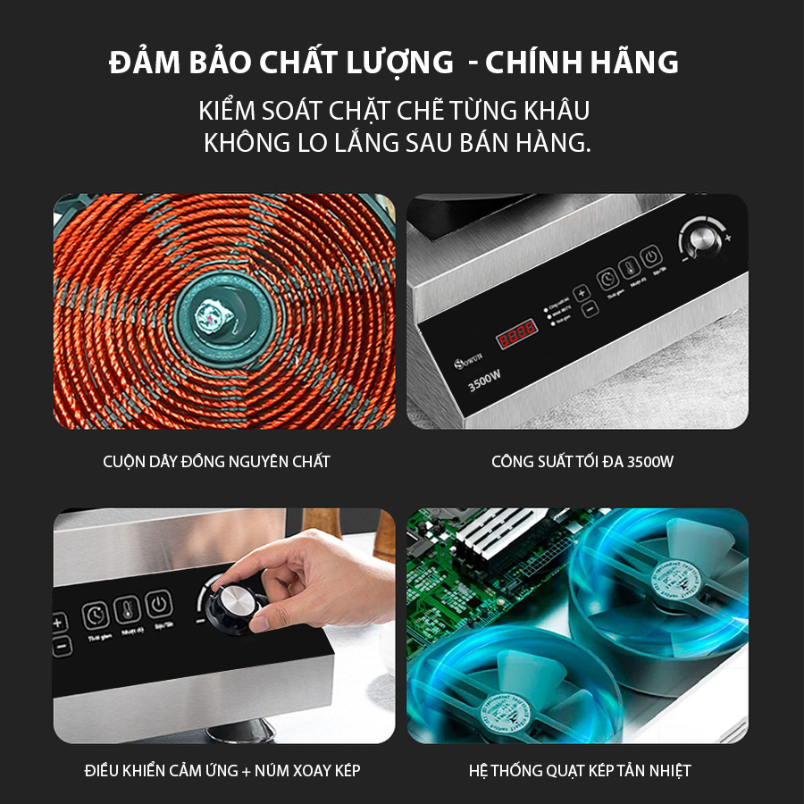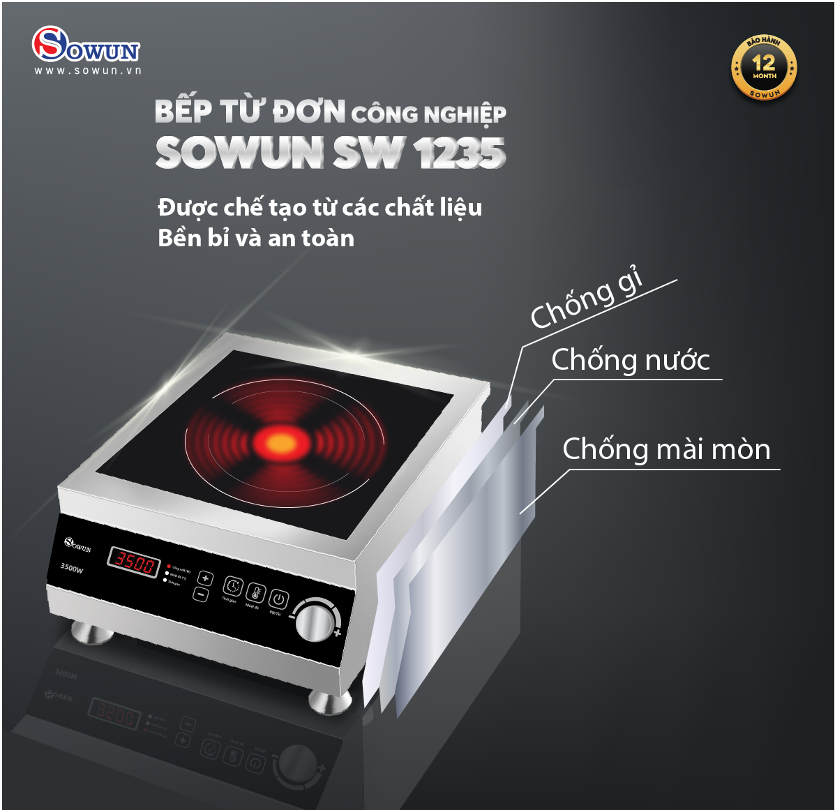 Bếp từ công nghiệp SOWUN SW 1235 được chế tạo từ các chất liệu bền bỉ và an toàn: