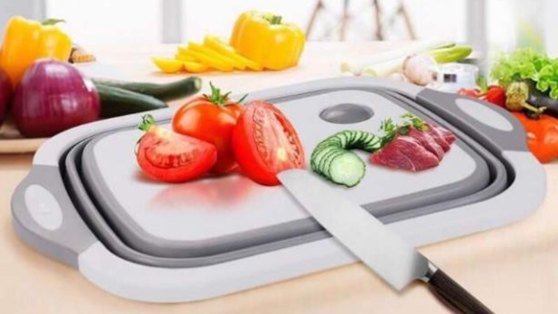 - Dụng cụ như thớt kết hợp (cutting board with storage) cho phép cắt & chứa thực phẩm vào một thiết bị duy nhất.