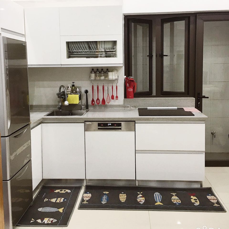 - Lắp kệ mở, móc treo, và đèn chiếu sáng gầm tủ để tạo cảm giác rộng rãi, đồng thời đảm bảo công năng và thẩm mỹ cho không gian bếp.